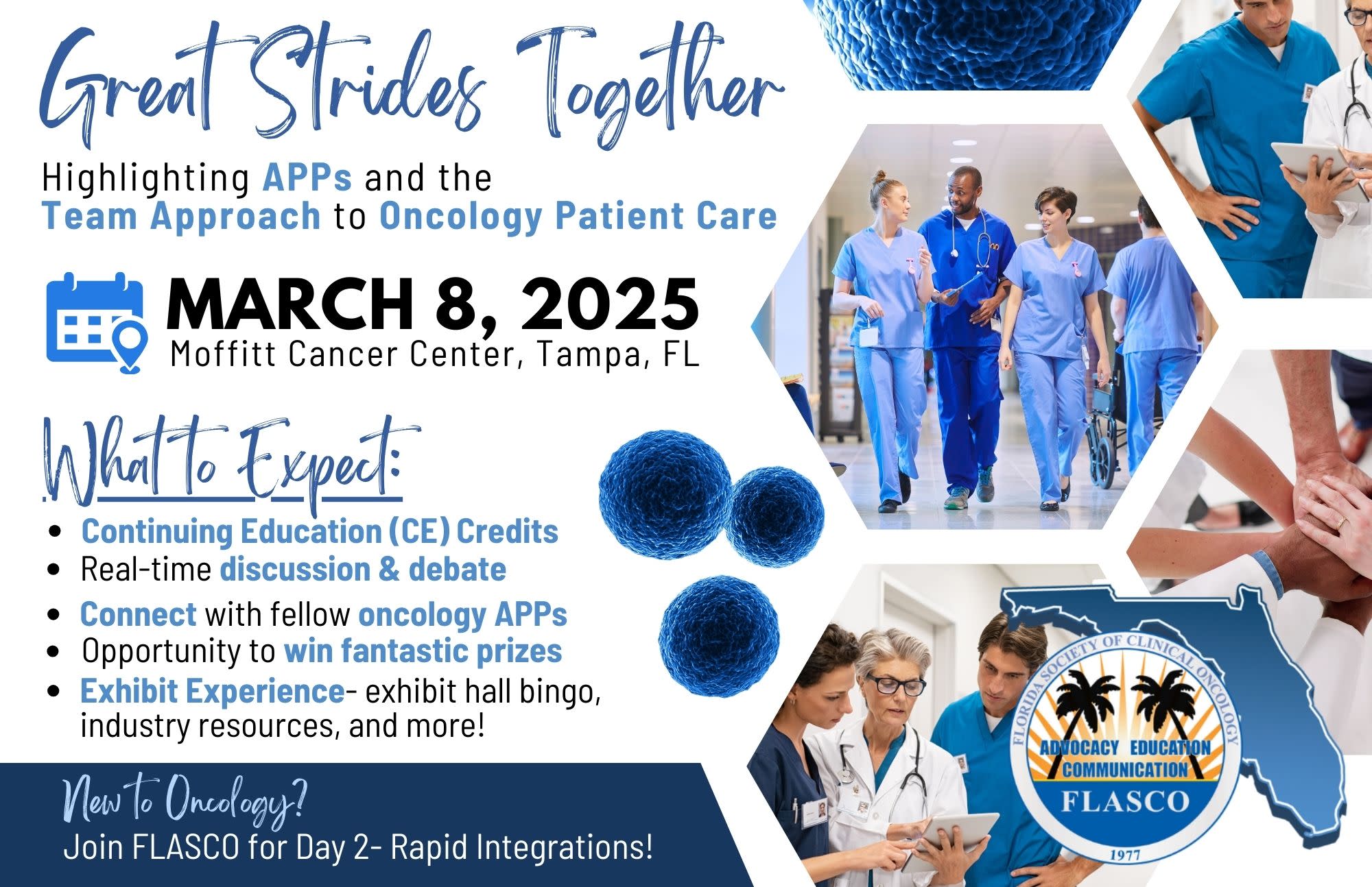 The Great Strides Together program is a multi-facility represented and planned meeting that includes continuing medical education credits designed for oncology physicians, nurses, nurse practitioners, physician assistants, pharmacists as well as other healthcare professionals involved in the management of cancer patients. The Great Strides Together program is well established in the state of Florida. Based on evaluations from previous years, this meeting delivers a state-of-the-art educational experience to provide healthcare professionals with the tools to offer the best quality of care to their patients. The underlying theme of this conference is about the “Team” and how the physician and the support staff work together to provide the best care for the patient.