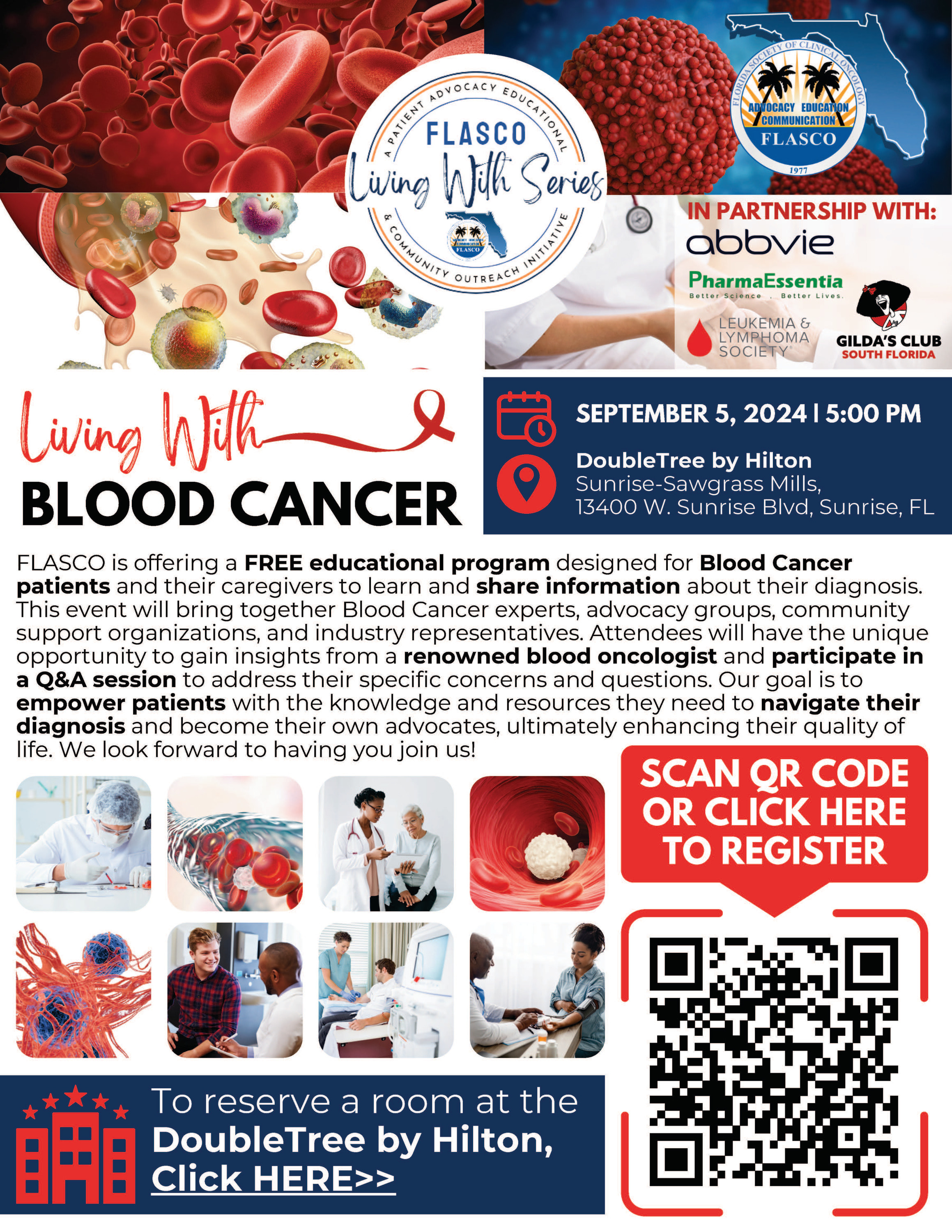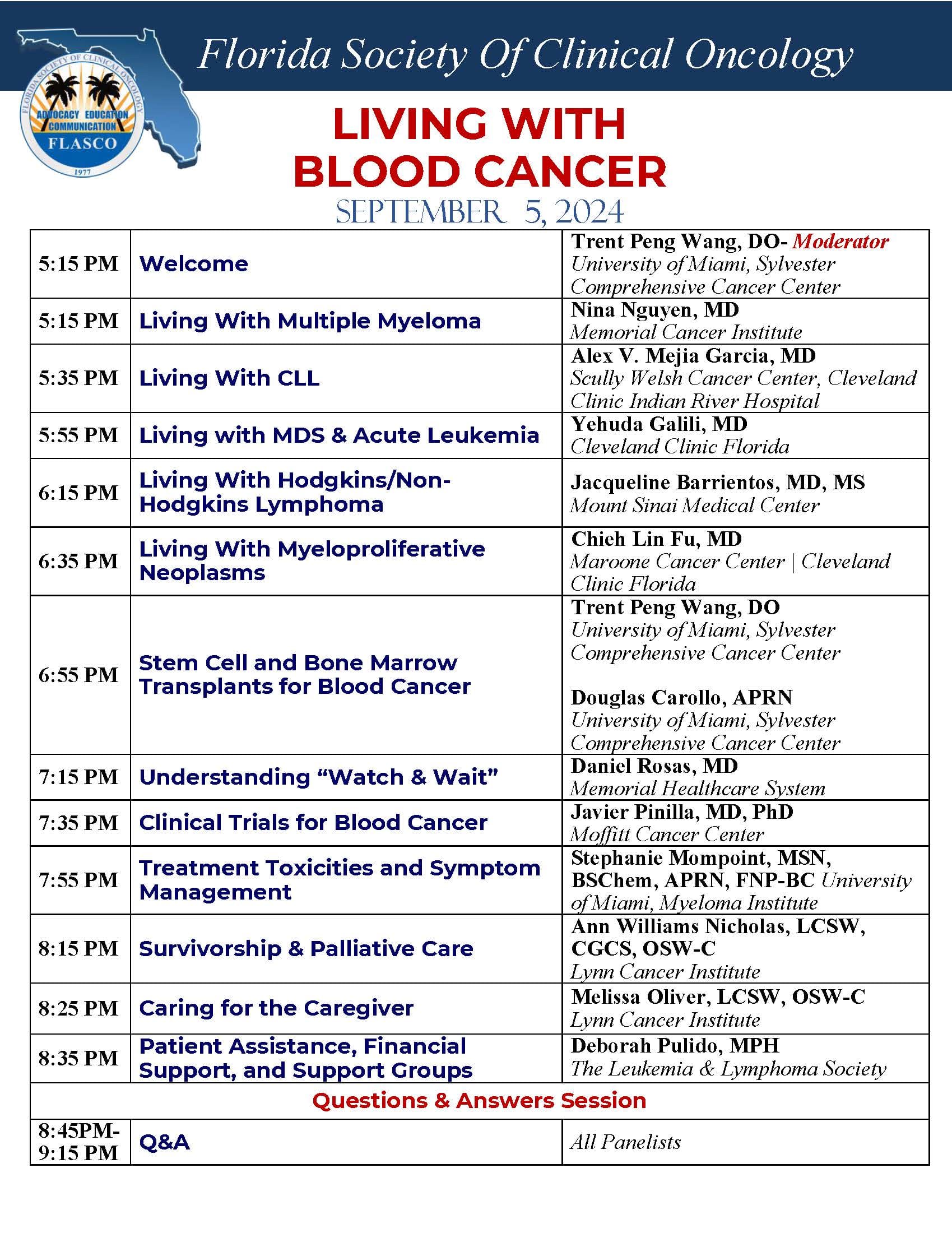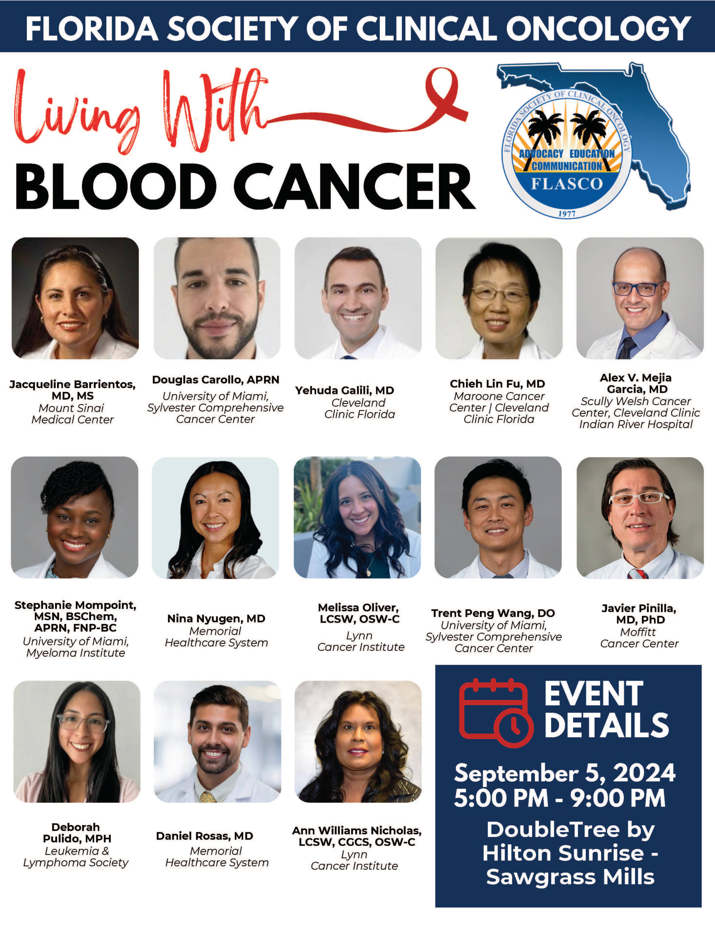 Florida Society of Clinical Oncology (FLASCO) is hosting a free educational program for Blood Cancer patients and their caregivers to learn and exchange information regarding a blood cancer diagnosis. We will bring together Oncology/Hematology Experts, Advocacy Groups, Community Support Groups, and Industry Representatives to empower patients with the information and resources needed to navigate a diagnosis, become their own advocates to live an enhanced quality of life. Dinner will be provided.